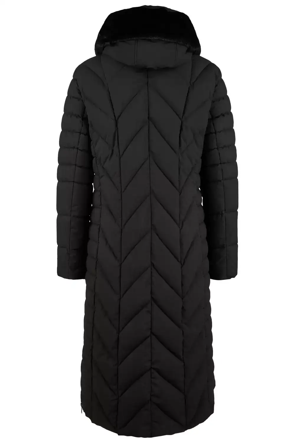Shop the BARBARA LEBEK Longline Padded Coat in Black. Features a detachable faux fur-trimmed hood, secure zip pockets, and mixed quilting for a warm, elegant look.