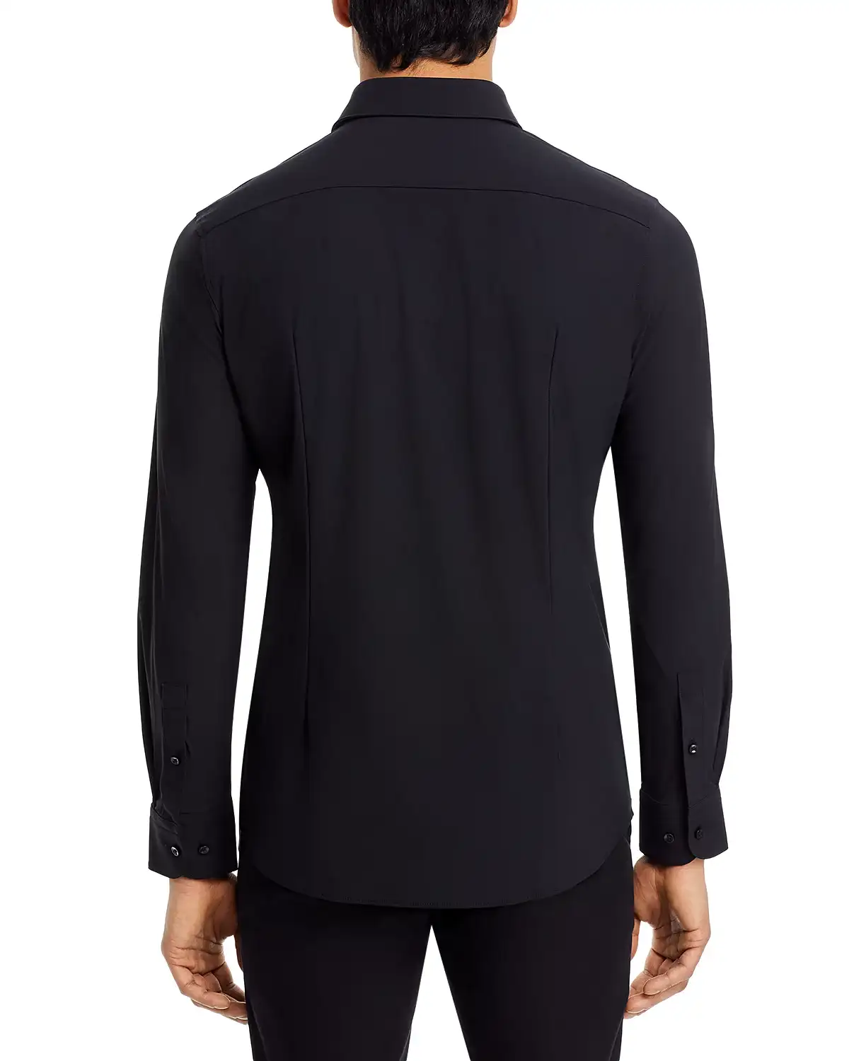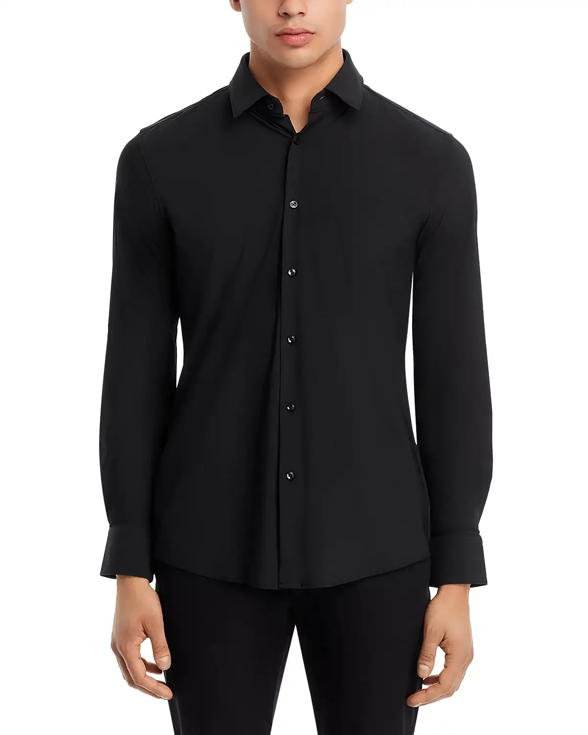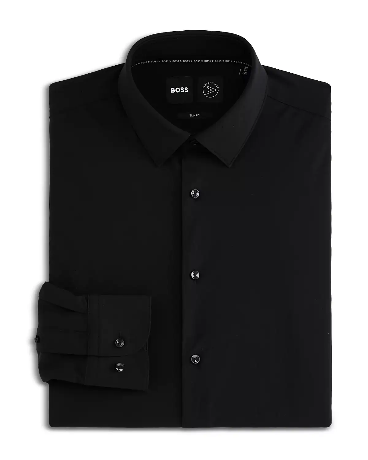 Slim-fit BOSS Hank dress shirt in black performance fabric with a Kent collar and button cuffs.