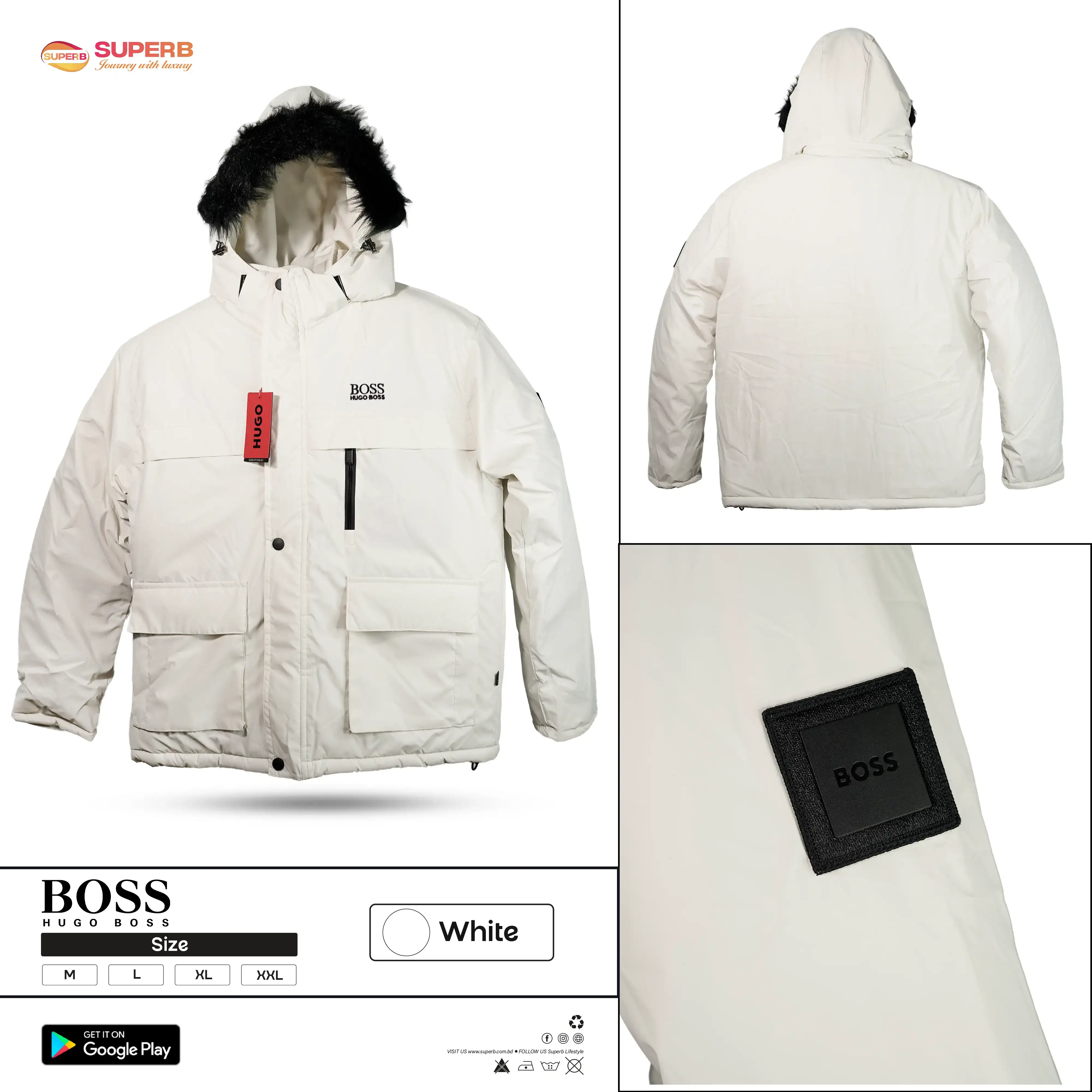 Stay warm in style with the BOSS Hugo Boss men’s jacket. Rated to -40°C, features sherpa lining, faux fur hood, flap pockets, and signature BOSS branding. Available in Black, White, and Deep See Green.