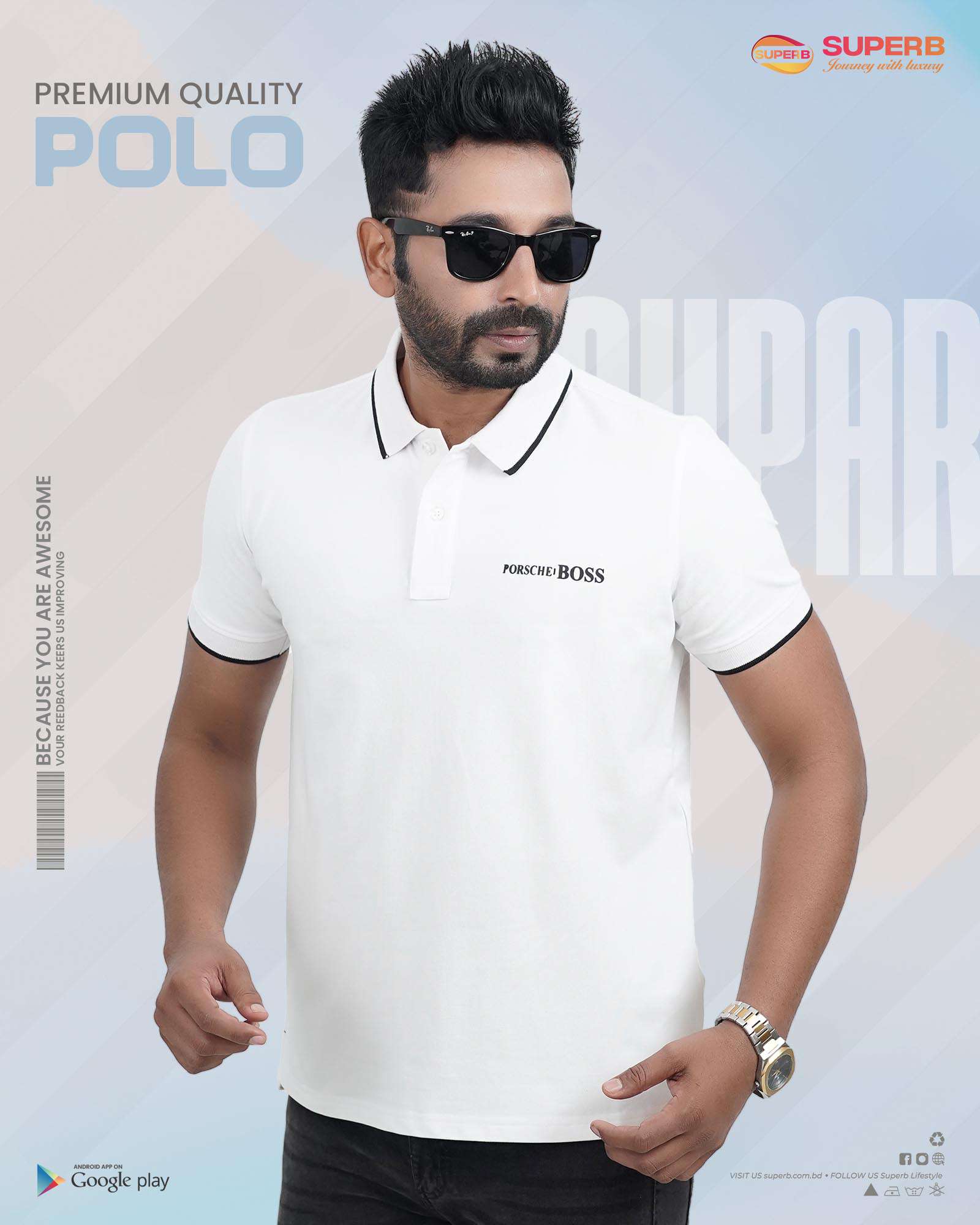 Stylish and comfortable premium quality white polo shirt with Porsche Boss branding, featuring a sleek design and contrasting black collar trim.