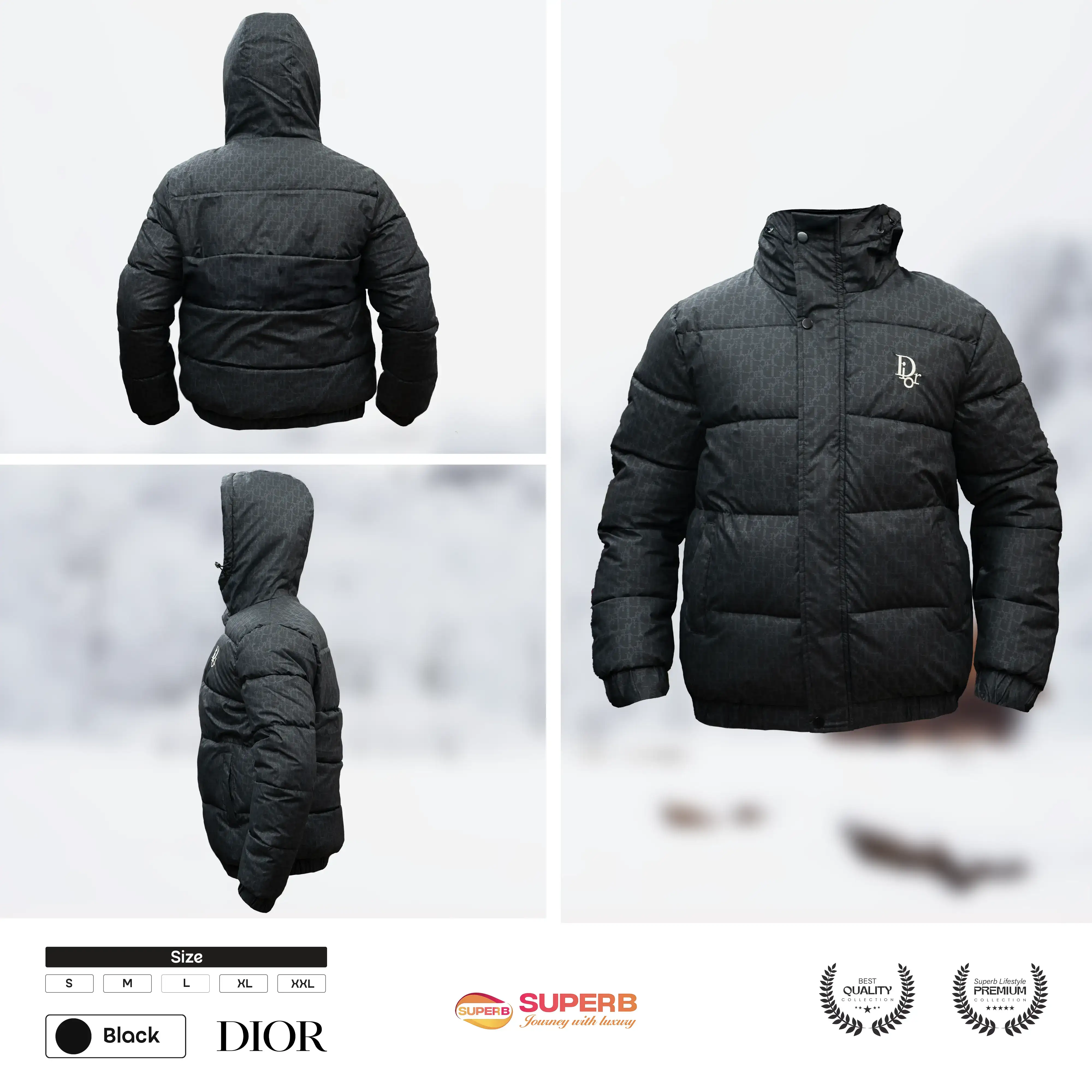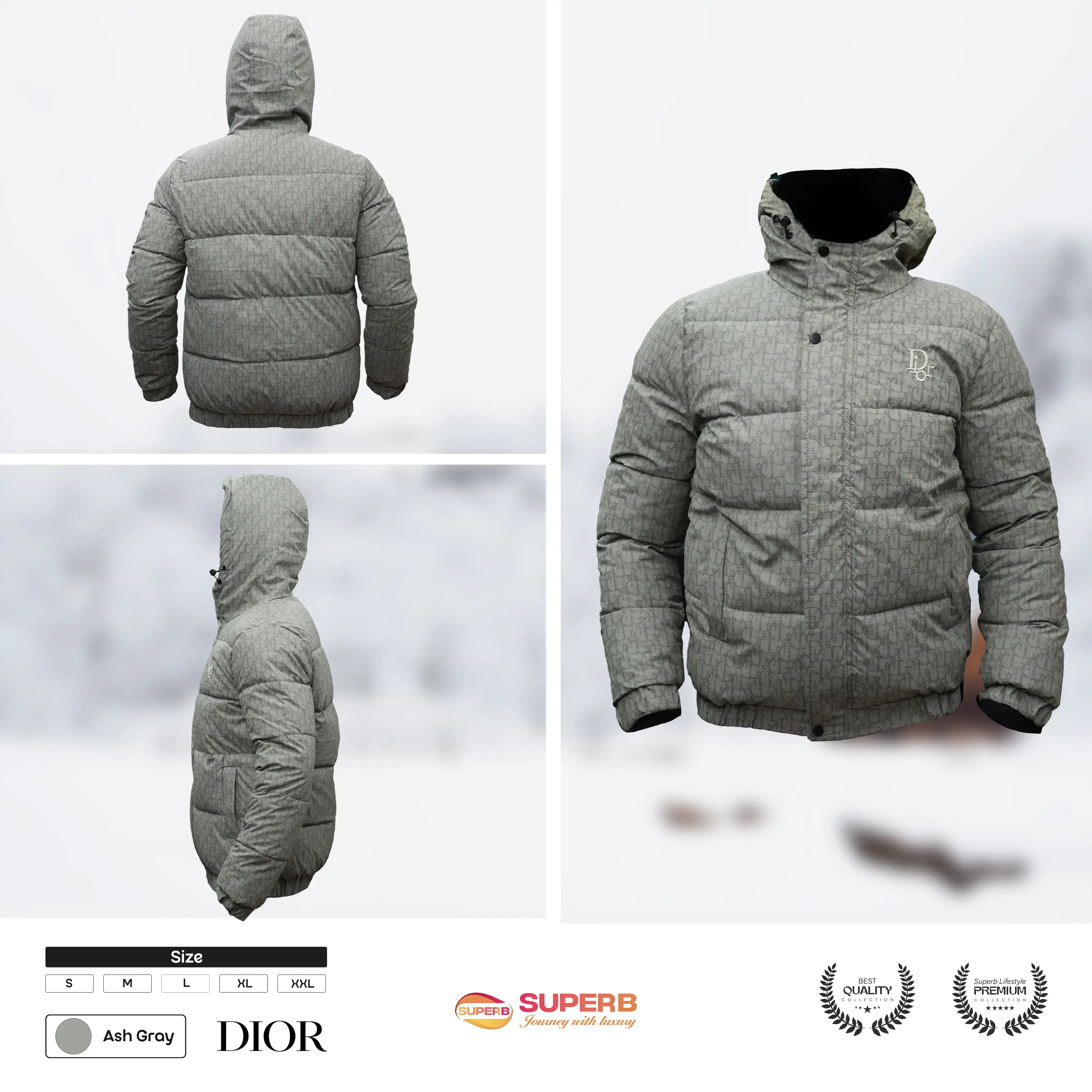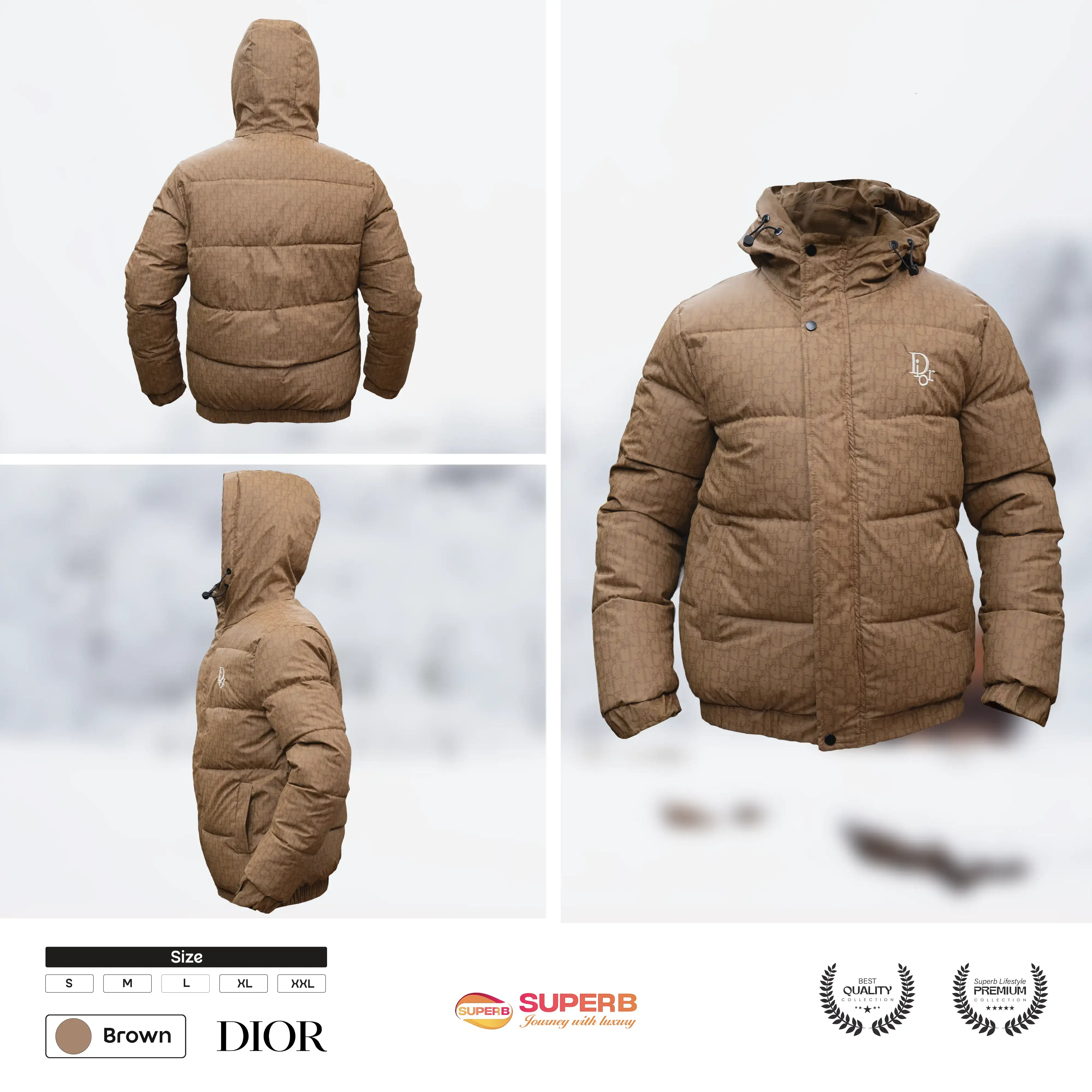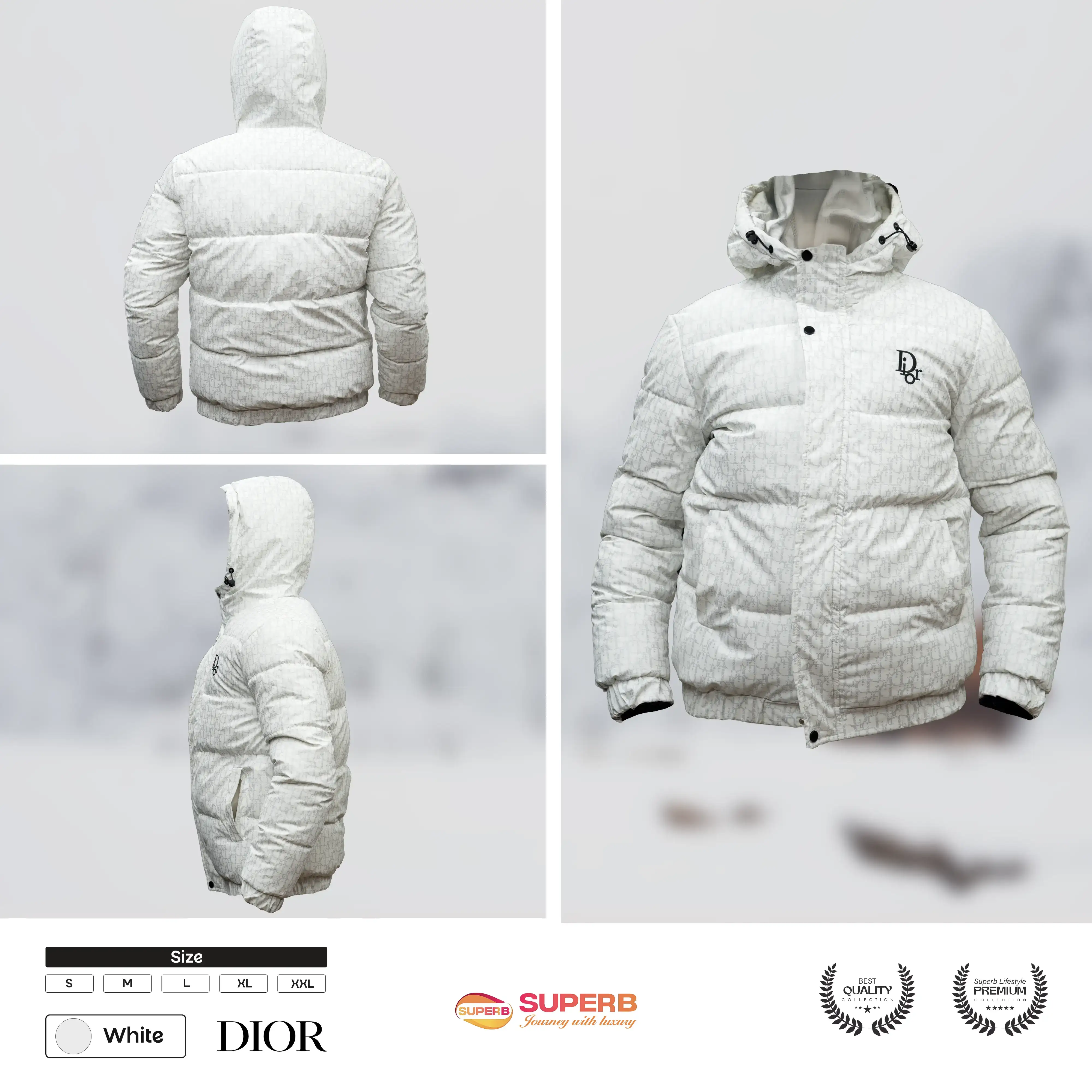 Stay warm in style with the Dior Down Jacket featuring the iconic Oblique pattern, hood, and zip closure. Available in white, gray, black, and brown.