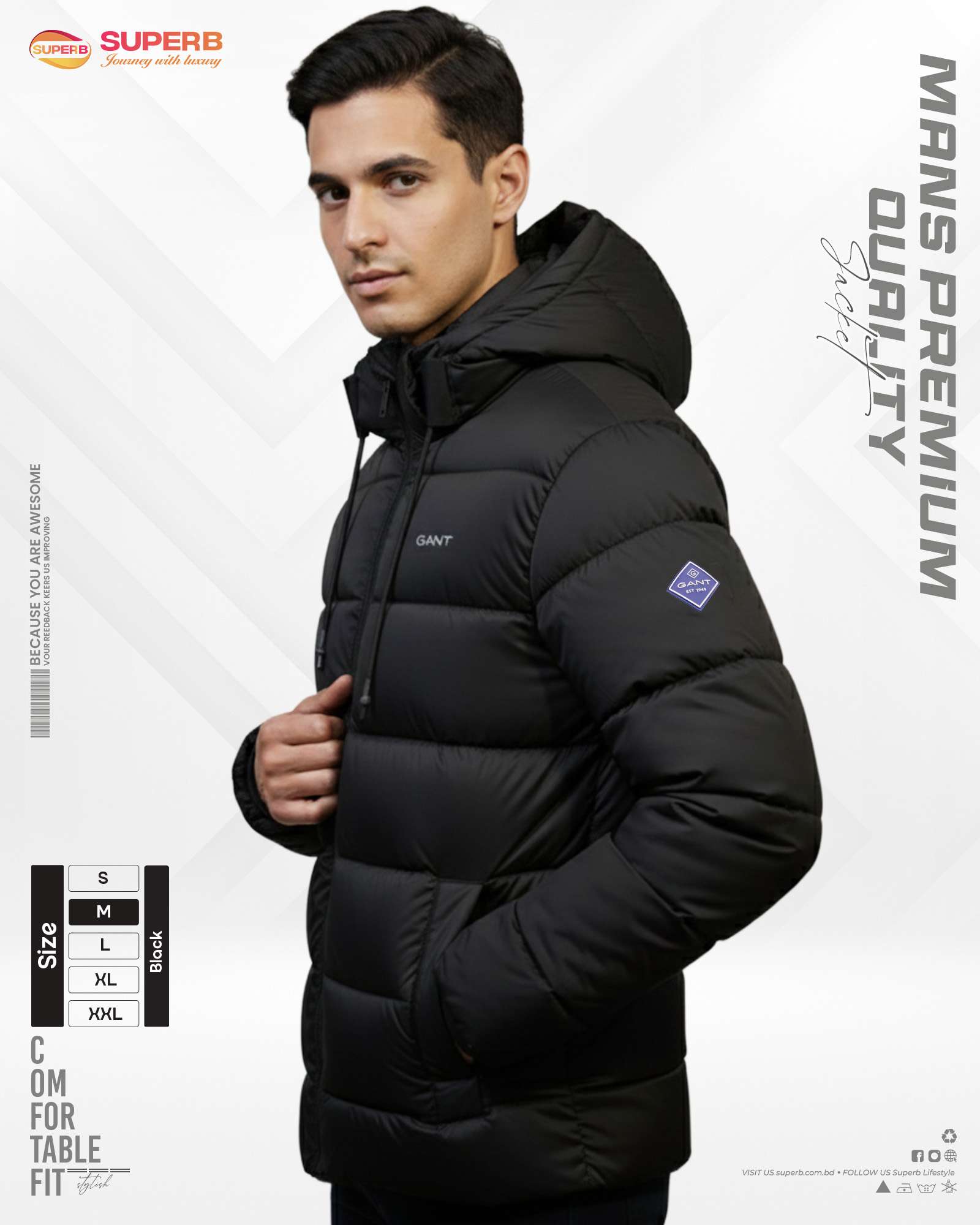 Gant hooded and padded jacket engineered for extreme cold, with a temperature rating of -5°C to -30°C. Available colors- Sky Blue , Olive , Navy blue ,Copper and Black