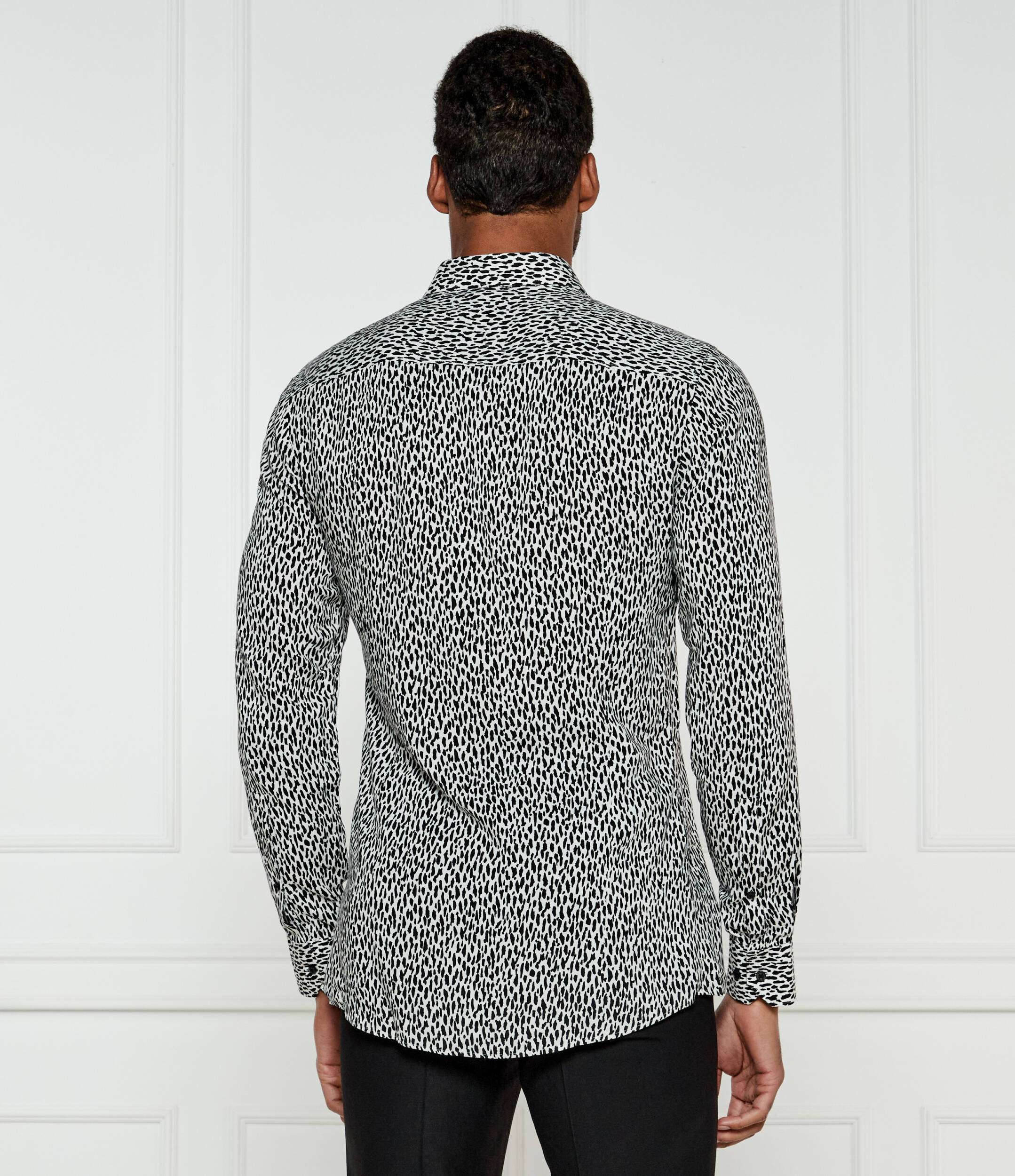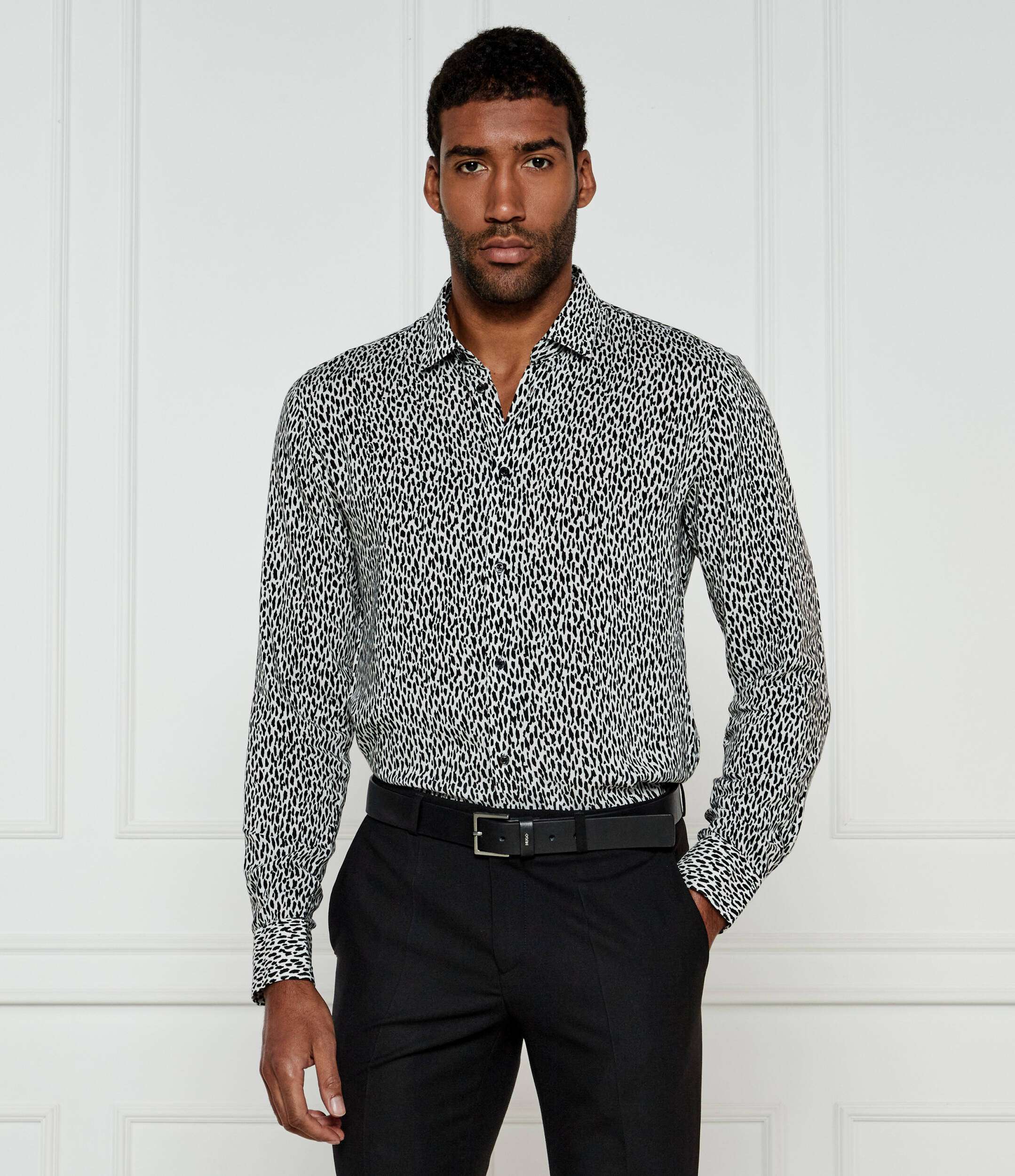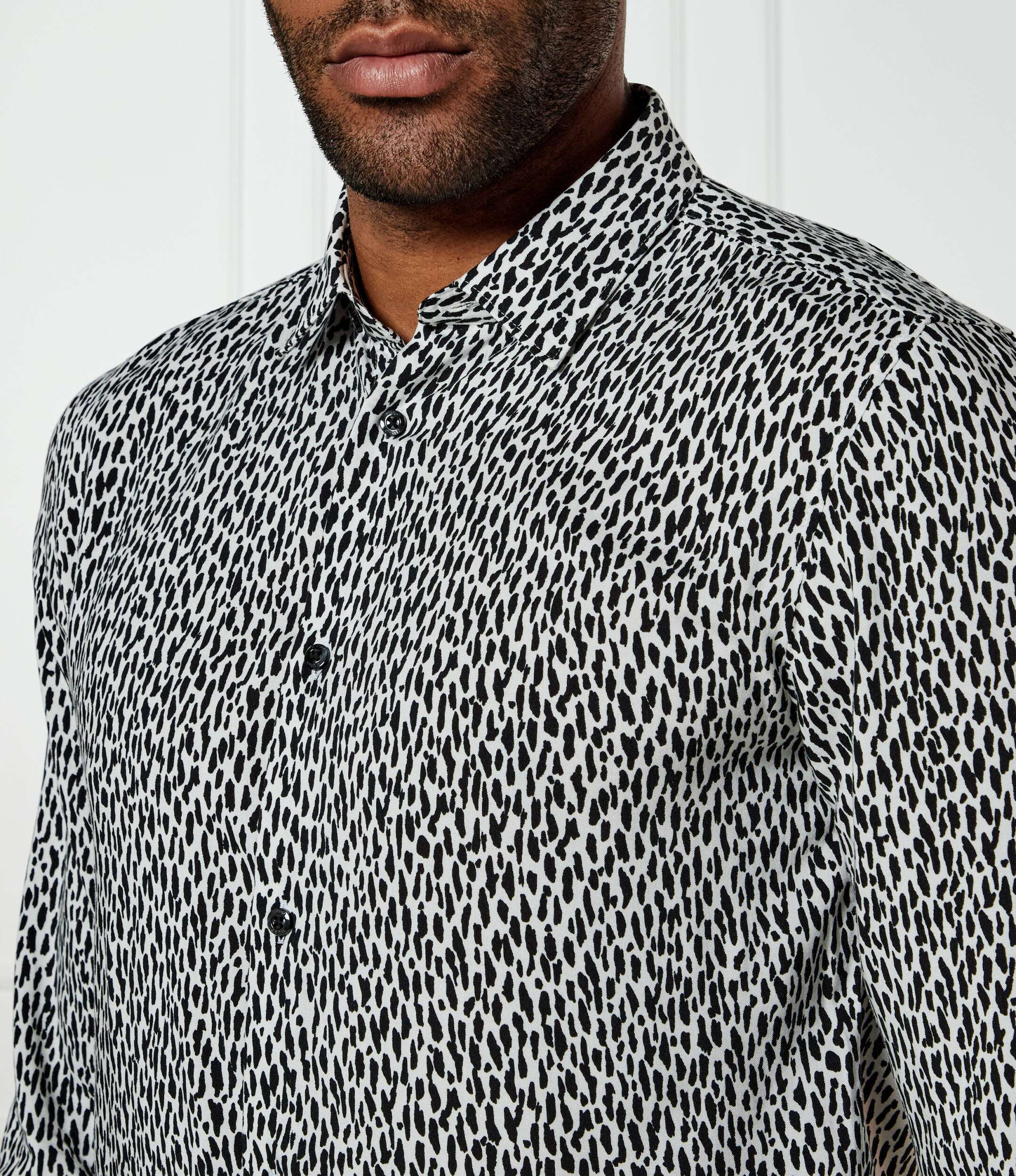 An expressive Hugo Boss shirt in viscose with an extra slim fit and dynamic abstract print—ideal for modern dressers seeking standout smart-casual style.