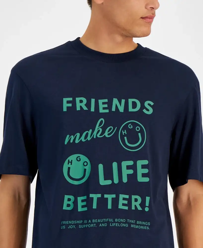 Stylish Hugo Boss men's t-shirt in a dark blue hue featuring a vibrant "Friends Make Life Better" graphic with smiley face details.