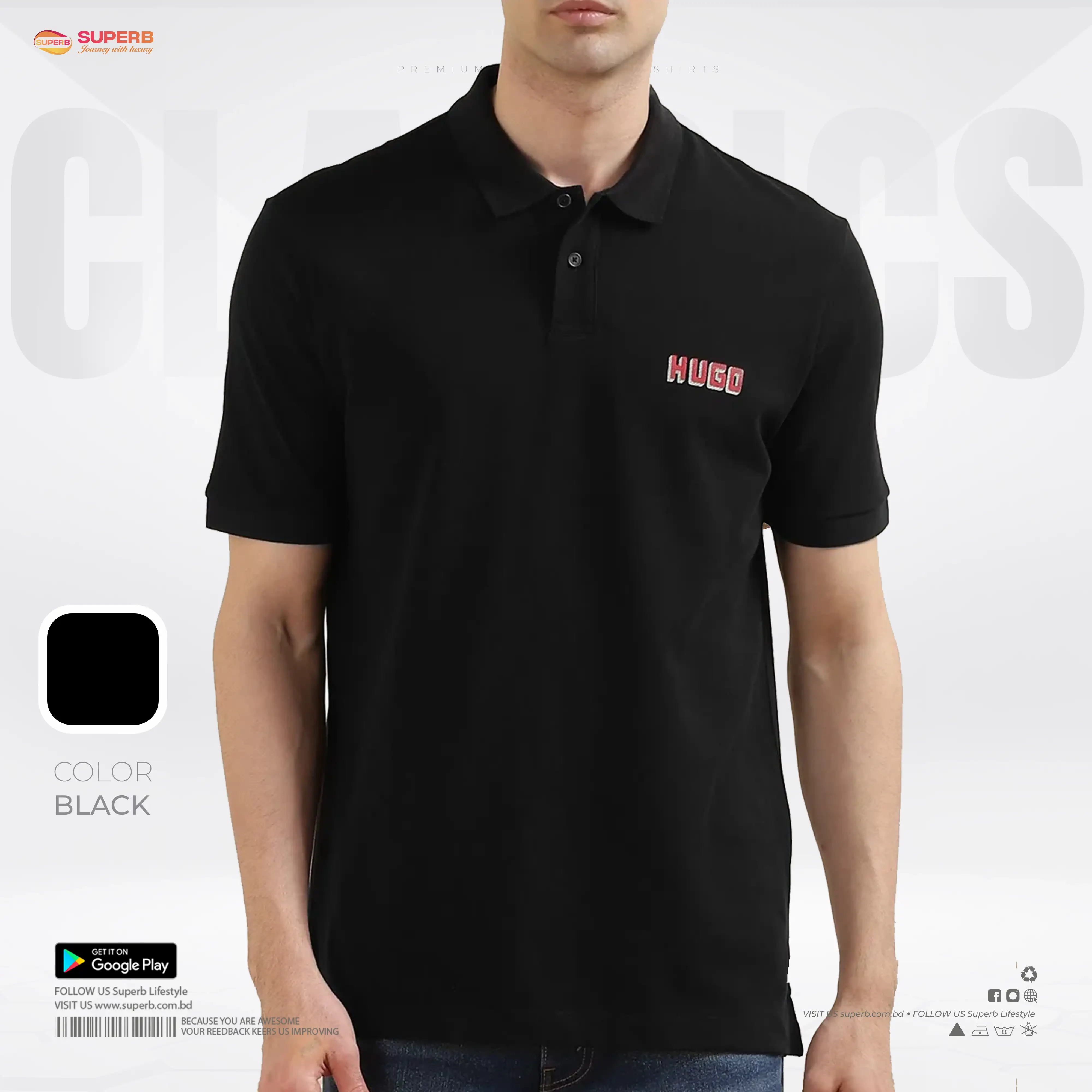 HUGO Men’s Black Polo T-Shirt | Abstract Chest Print | 100% Cotton Casual Wear || Superb