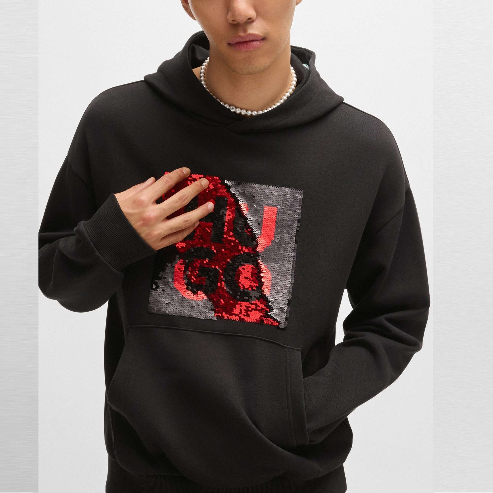 Statement HUGO hoodie in French-terry cotton with a relaxed fit, hooded neck, kangaroo pocket, and a unique brush-up color-changing sequinned logo.