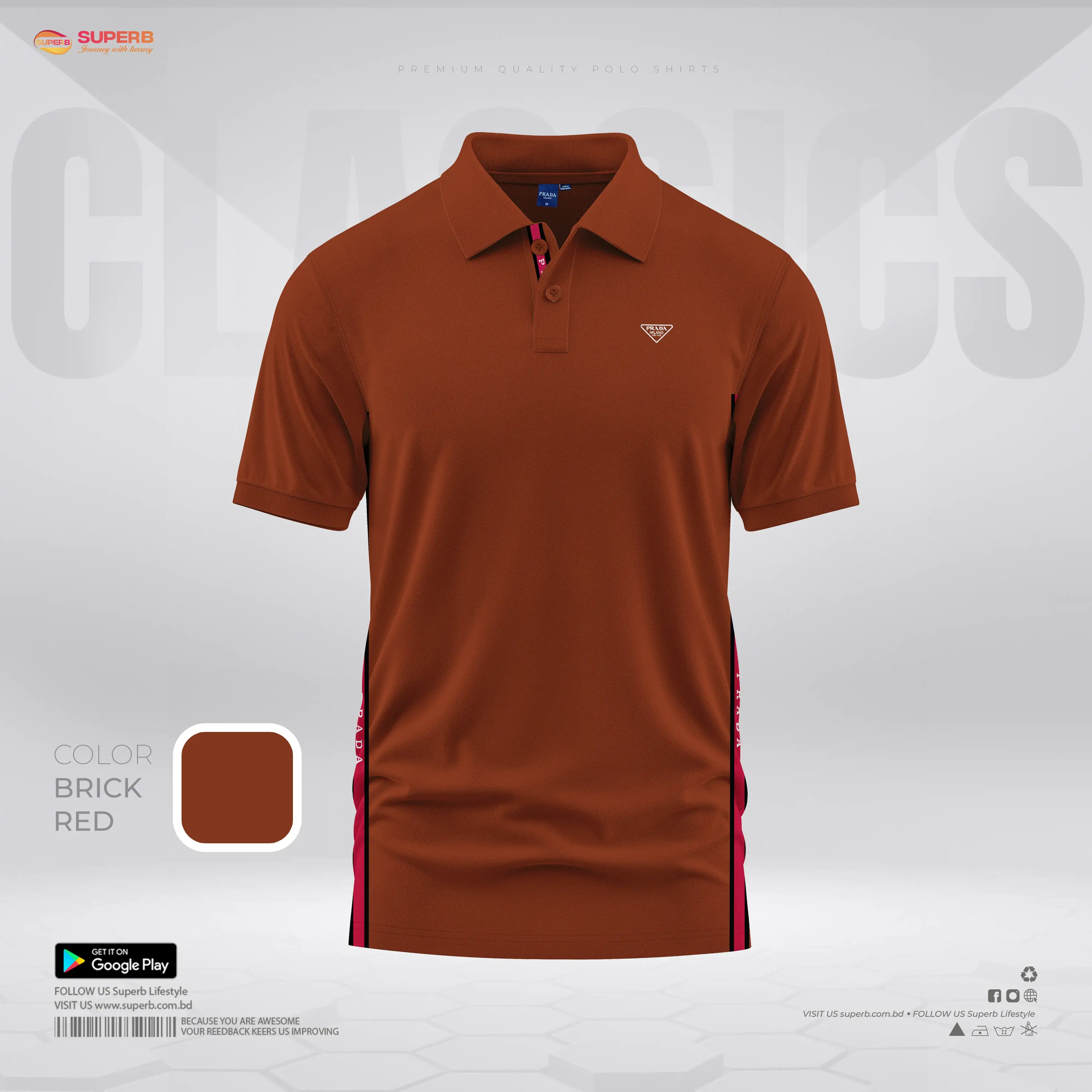 Discover the Prada Premium Polo Shirt with the iconic triangle logo and modern side stripe. Crafted from breathable knit cotton for a stylish and comfortable fit. Available in navy Blue, white, black, and brick red.