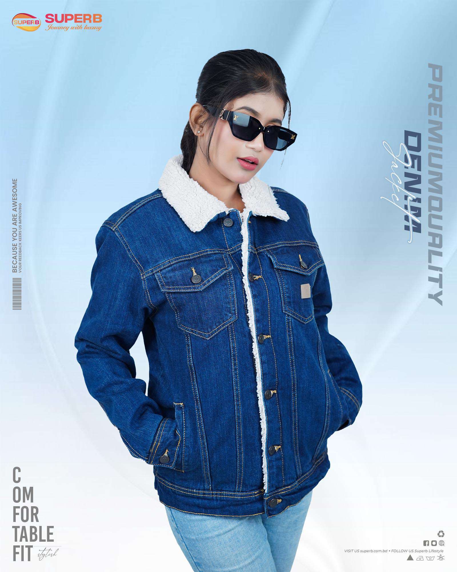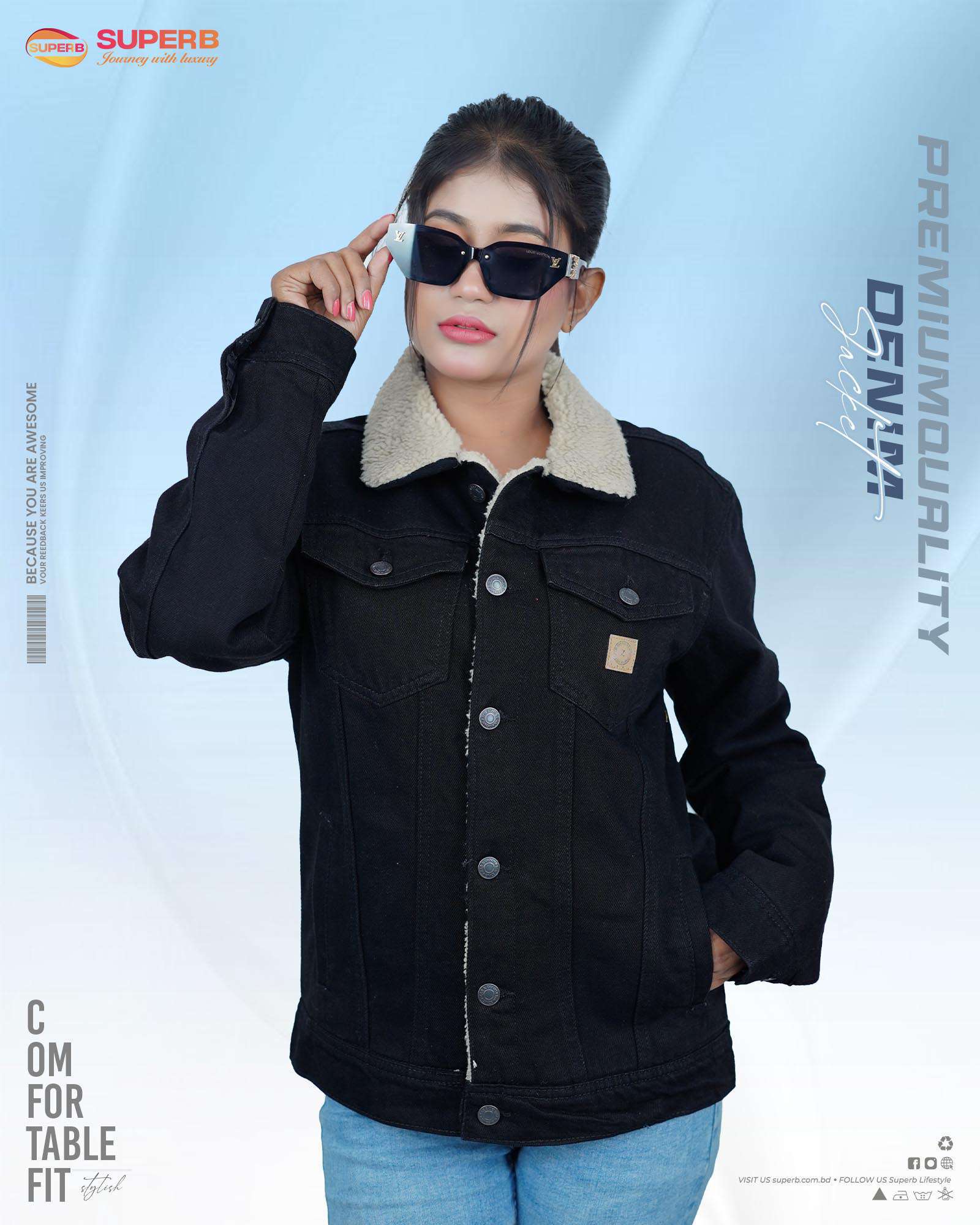 Stay stylish with our premium denim jacket featuring a sherpa collar and durable denim construction. Perfect for versatile, everyday wear, this jacket is available in classic black and blue color options. Shop now at superb.com.bd!
