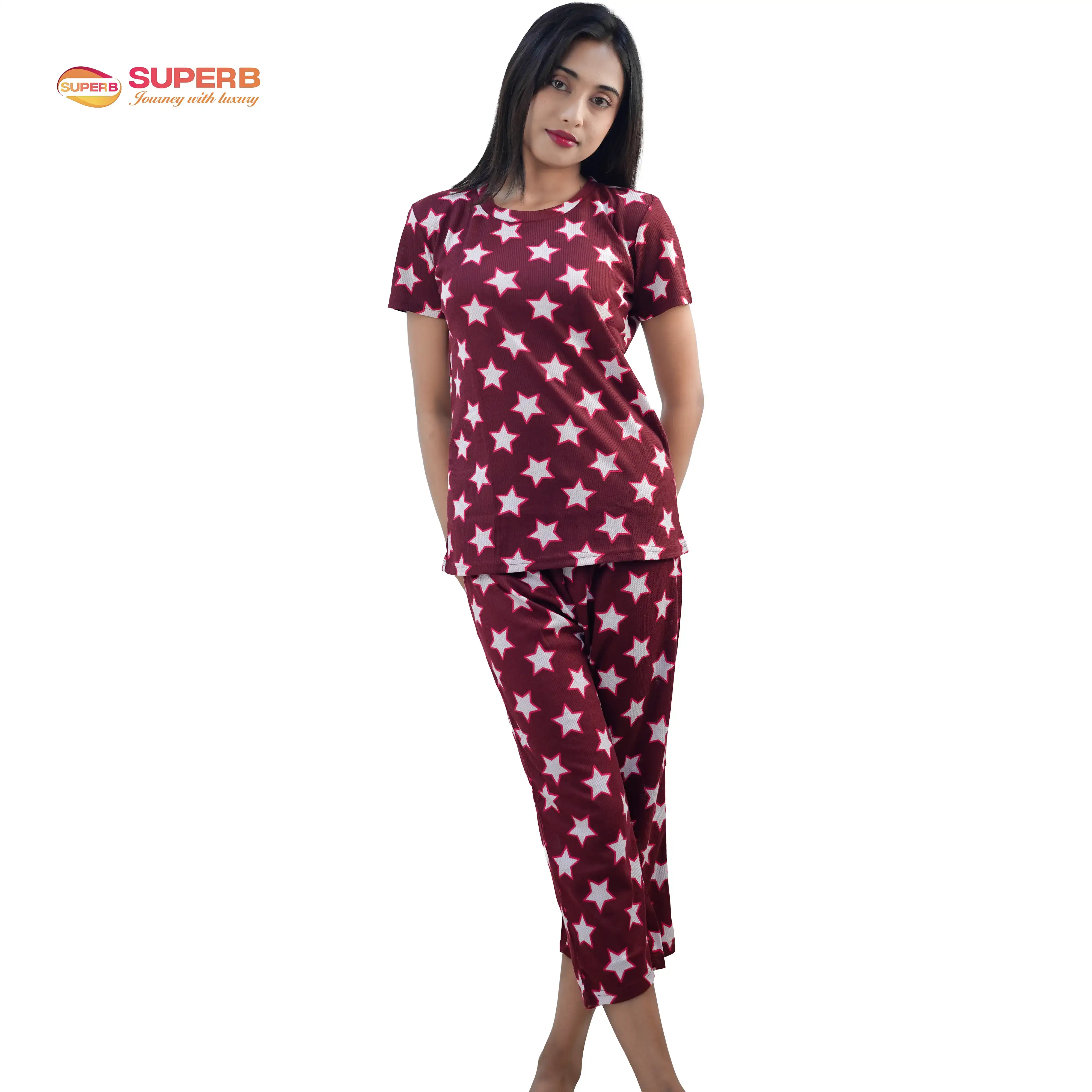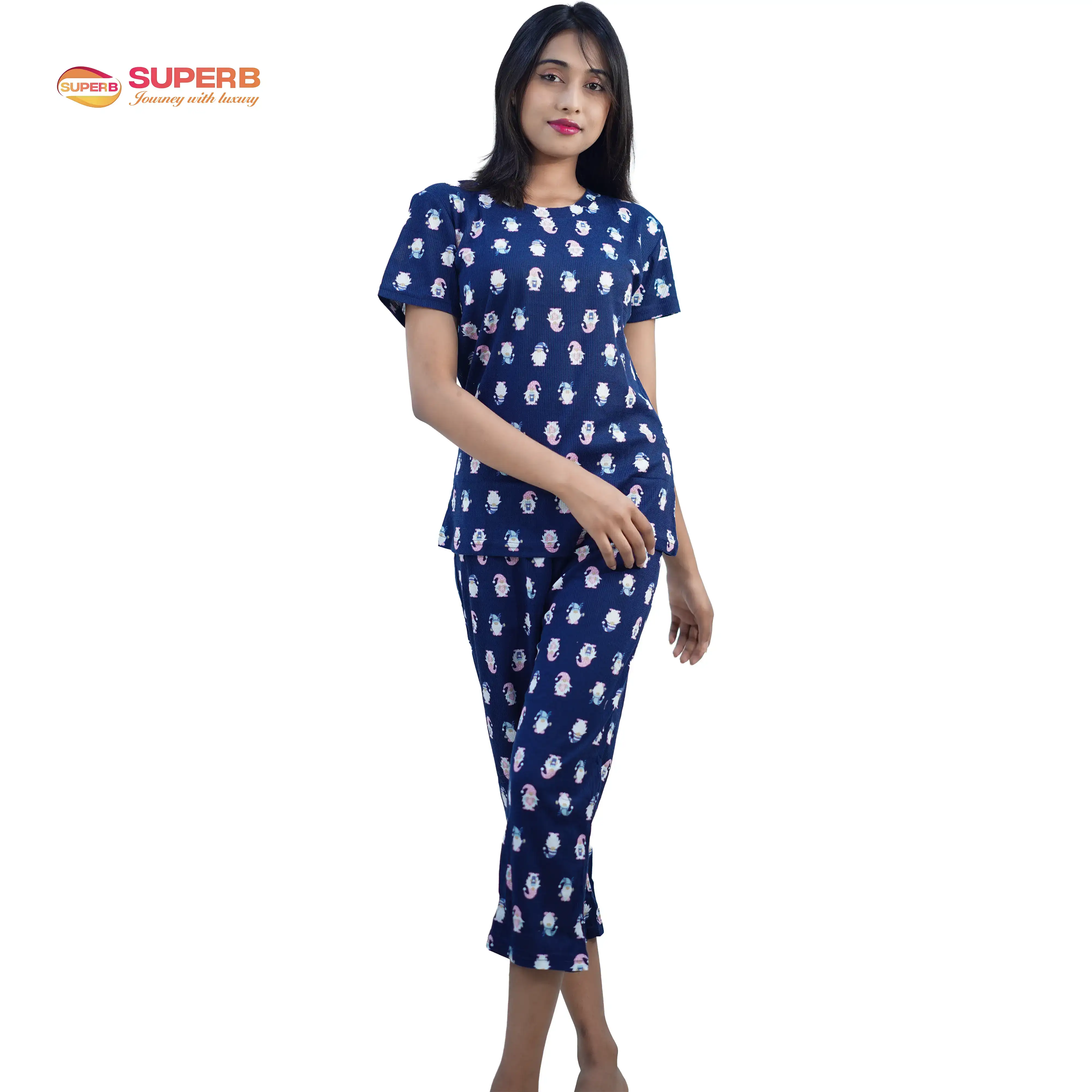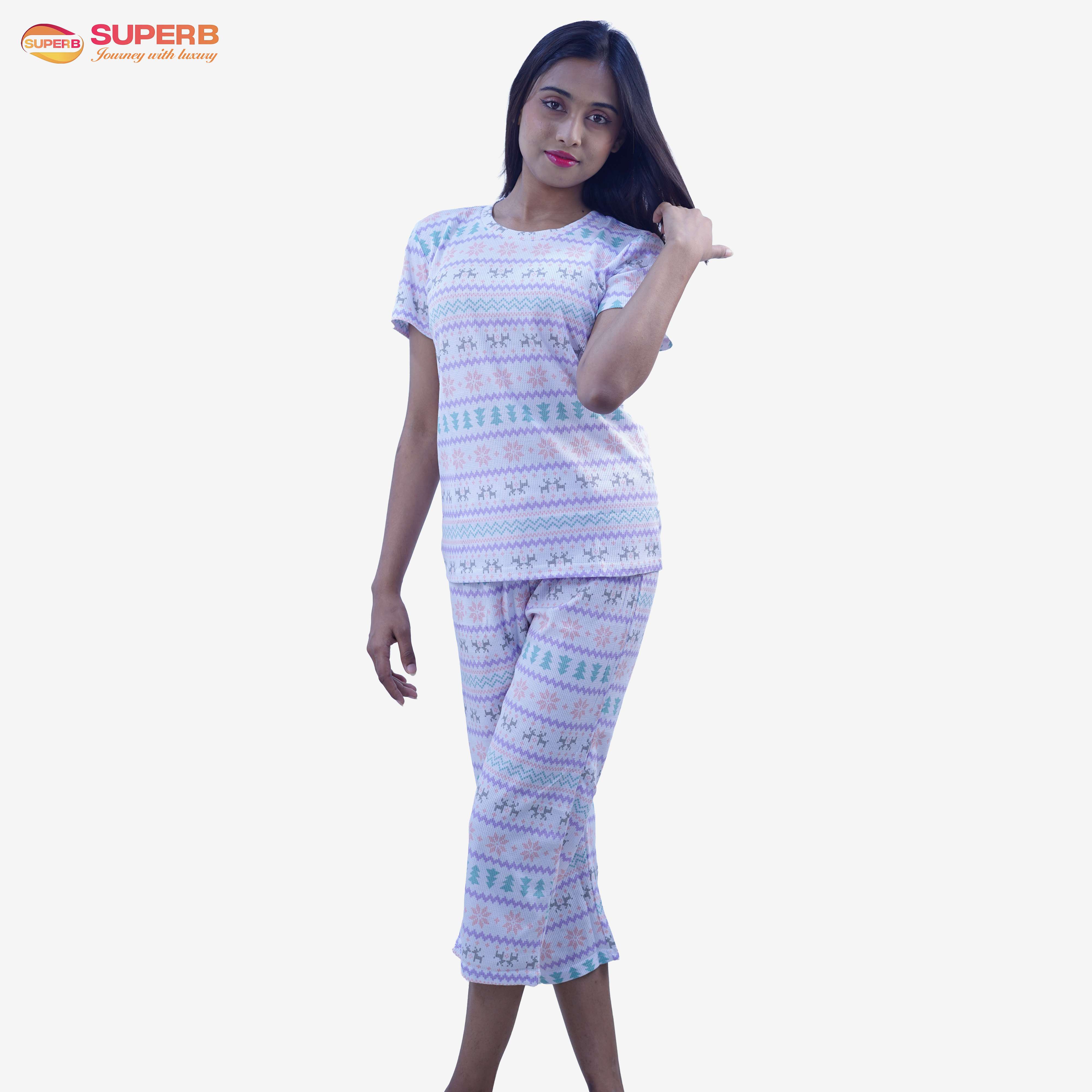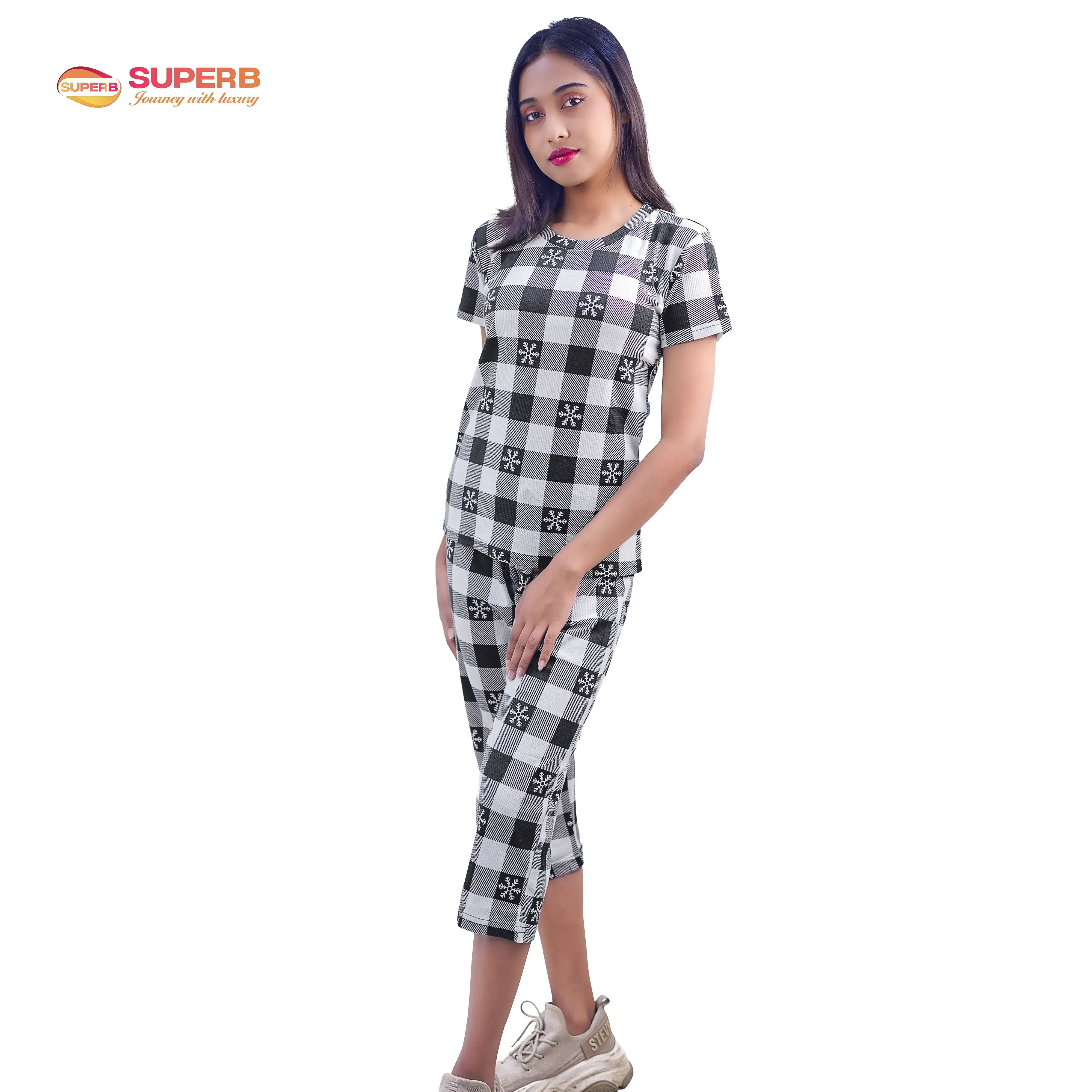 Explore our women’s top & bottom set made from a soft cotton blend. This short-sleeve t-shirt and cropped pant combo offers breathability, flexibility, and stylish prints for everyday comfort.